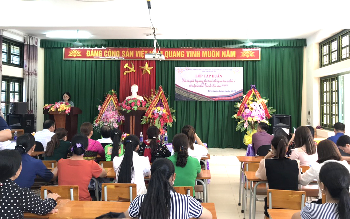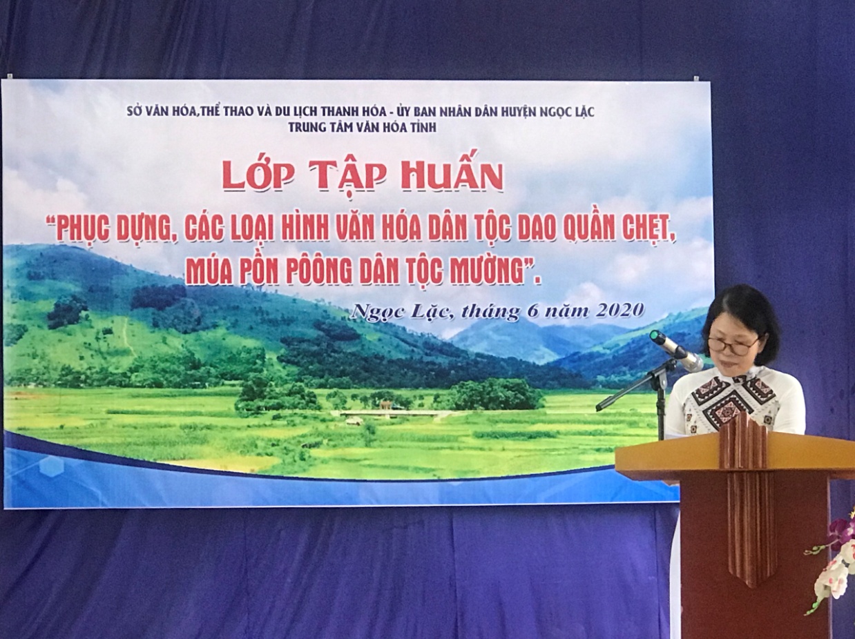 Sáng 23/6, Trung tâm Văn hóa tỉnh Thanh Hóa phối hợp với UBND huyện Bá Thước tổ chức khai mạc lớp tập huấn “Bảo tồn, phát huy trang phục truyền thống các Dân tộc thiểu số trên địa bàn tỉnh Thanh Hóa năm 2020”. Tham dự có các đồng chí: Nguyễn Thị Hoàng Yến, Trưởng phòng Nghiệp vụ Văn hoá, Sở Văn hoá, Thể thao và Du lịch Thanh Hóa; Nguyễn Thị Mai Hương, Giám đốc Trung tâm Văn hóa tỉnh; Lò Văn Thắng, Phó Chủ tịch UBND huyện Bá Thước, Lê Văn Sự Phó phòng VH-TT huyện; Lãnh đạo Trung tâm VH-TT-TT&DL 11 huyện miền núi cùng 45 nghệ nhân, học viên.