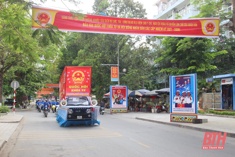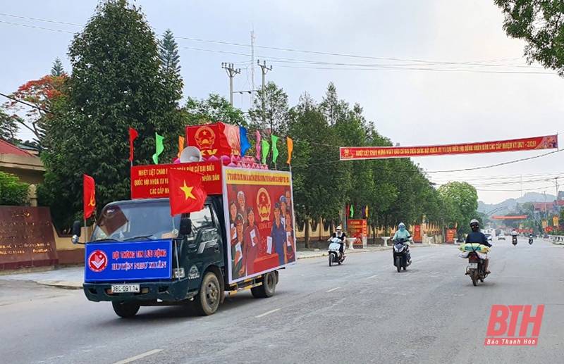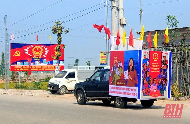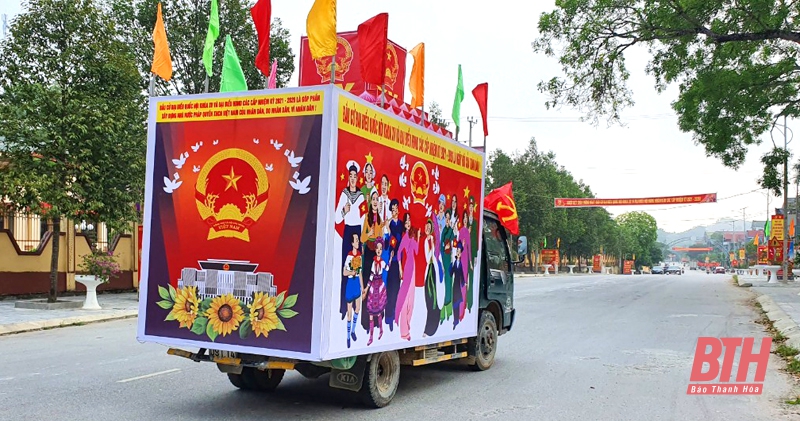 Xe tuyên tuyền lưu động của huyện Triệu Sơn đi từ trung tâm huyện tới các xã để tuyên truyền chào mừng ngày hội lớn non sông.