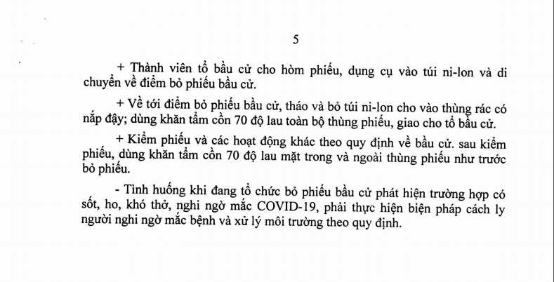 Để tổ chức thành công cuộc bầu cử Đại biểu Quốc hội khóa XV và bầu cử đại biểu HĐND các cấp nhiệm kỳ 2021-2026 trên địa bàn tỉnh trong điều kiện dịch bệnh Covid-19 diễn biến phức tạp, thực hiện chỉ đạo của Thường trực Tỉnh ủy tại Công văn số 724-CV/VPTU ngày 11/5/2021, Chủ tịch UBND tỉnh yêu cầu UBND các huyện, thị xã, thành phố, các sở, ban, ngành, đơn vị cấp tỉnh khẩn trương triển khai thực hiện một số nội dung sau: