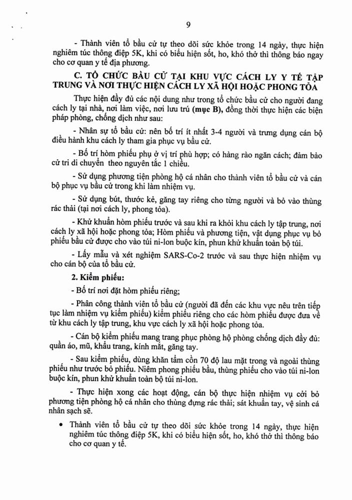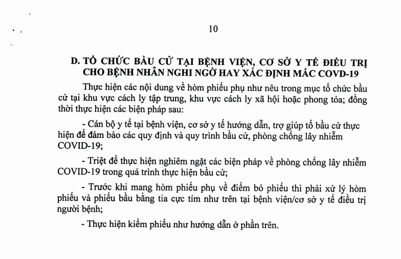 Giao Bộ Chỉ huy Quân sự tỉnh rà soát kiểm tra các khu cách ly tập trung, đảm bảo các điều kiện cho cử tri đang cách ly tham gia bầu cử (trong đó chú trọng Khu cách ly của Trung tâm Giáo dục Quốc phòng - An ninh Trường Đại học Hồng Đức). Chỉ đạo Ban Chỉ huy Quân sự các huyện, thị xã, thành phố đảm bảo công tác tổ chức bầu cử tại các khu cách ly tập trung của địa phương.