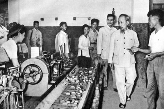 Gắn thi đua với lòng yêu nước và lòng yêu nước với thi đua, Chủ tịch Hồ Chí Minh đã xây dựng lên phong trào thi đua của Nhân dân ta sôi nổi, rộng khắp và mang đậm bản sắc của dân tộc Việt Nam.Trong ảnh: Chủ tịch Hồ Chí Minh thăm Nhà máy Diêm Thống Nhất những năm đầu khôi phục kinh tế (1956). (Ảnh tư liệu của TTXVN).